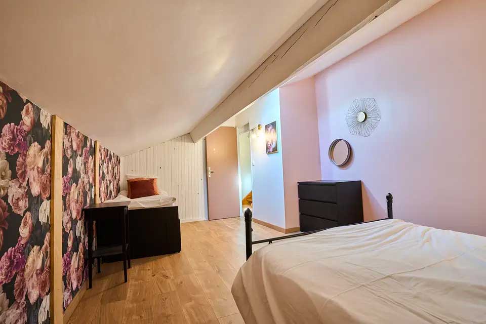 – Chambre rose : 1 lit double + 1 lit simple + 1 lit tiroir